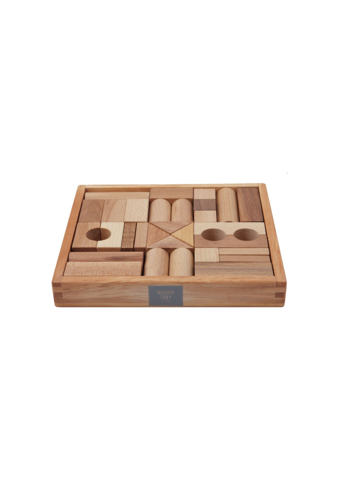 Présentés dans une boîte en bois massif, ces 30 blocs apportent de la joie pendant le jeu tout en constituant un élément décoratif original pour l’intérieur.